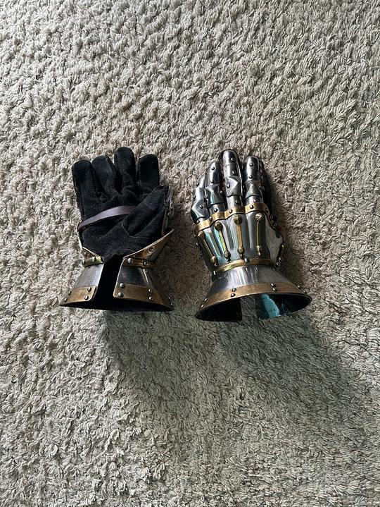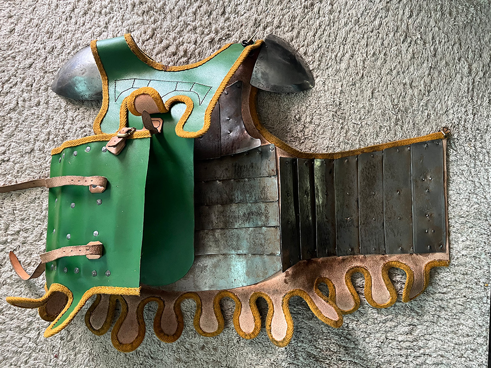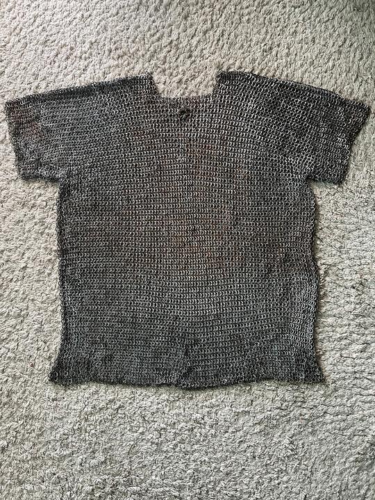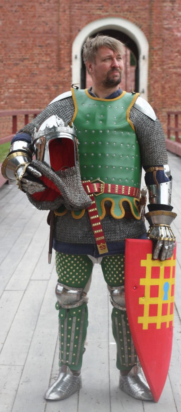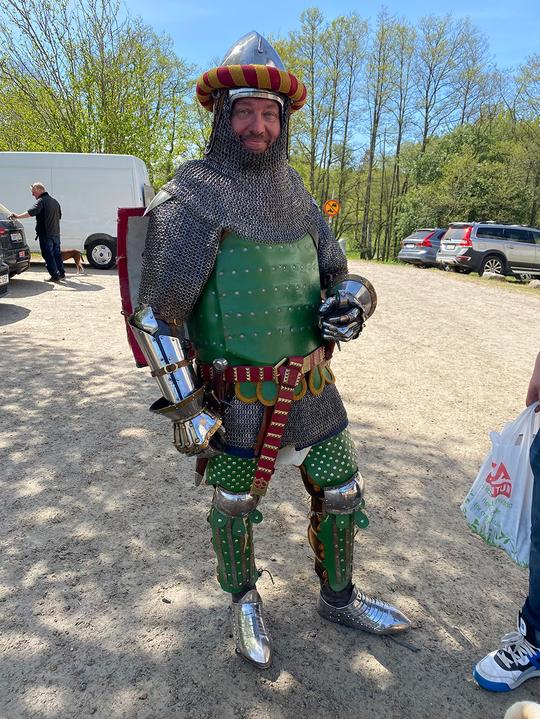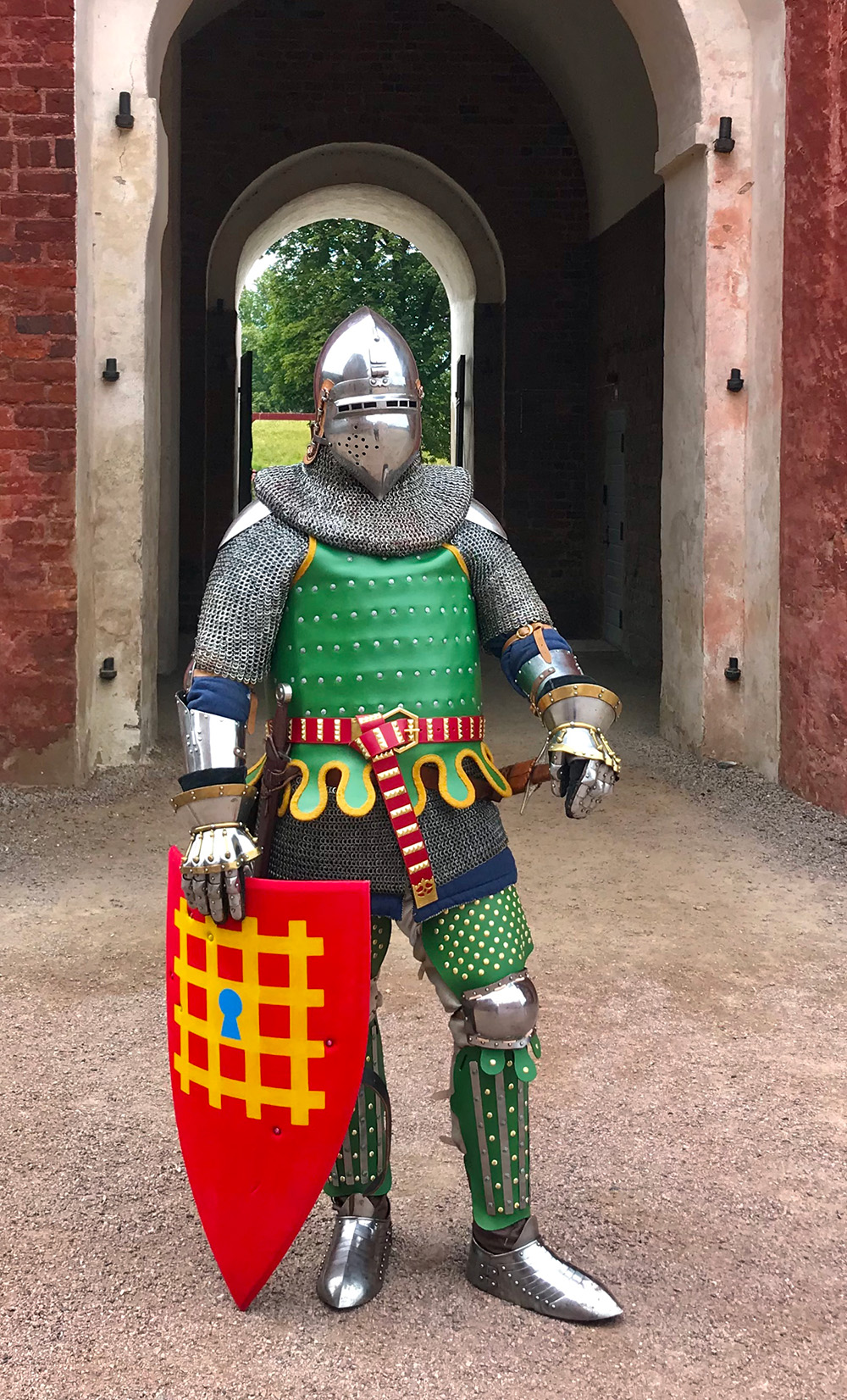 Denna rustning, förutom alla smidda metalldelar, har jag själv gjort. Ringbrynjan består av nästan 30 000 ringar, varav häften är ihopnitade. Kläderna har jag sytt själv efter mönster och med mycket huvudbry. Platan (coat-of-plates) är ihopknåpad efter mönster som bygger på lämningar som hittades i massgraven utanför Visby, från slaget som stod där 1361.