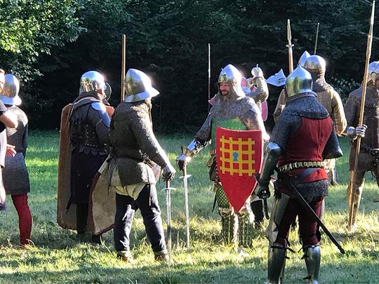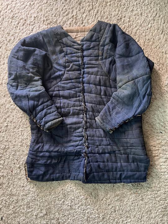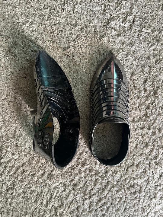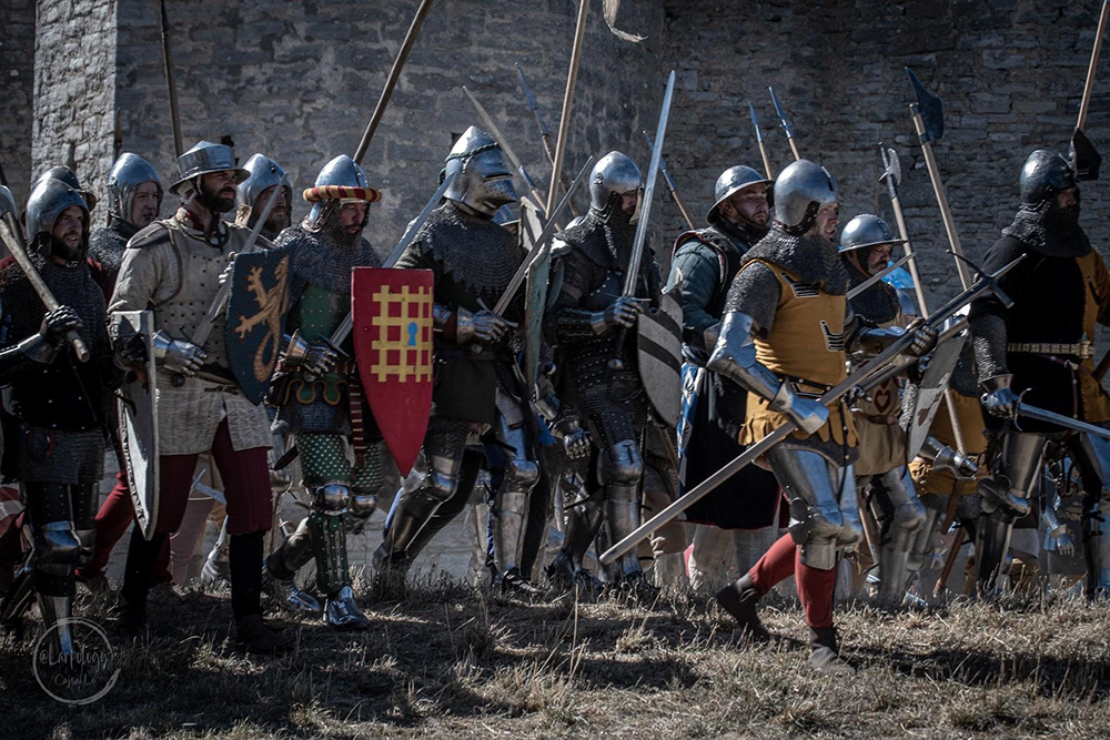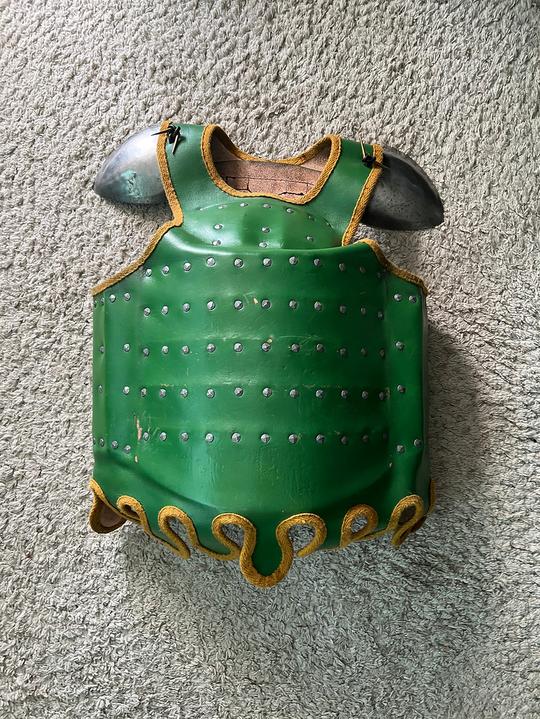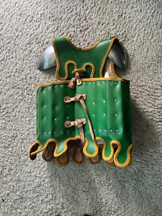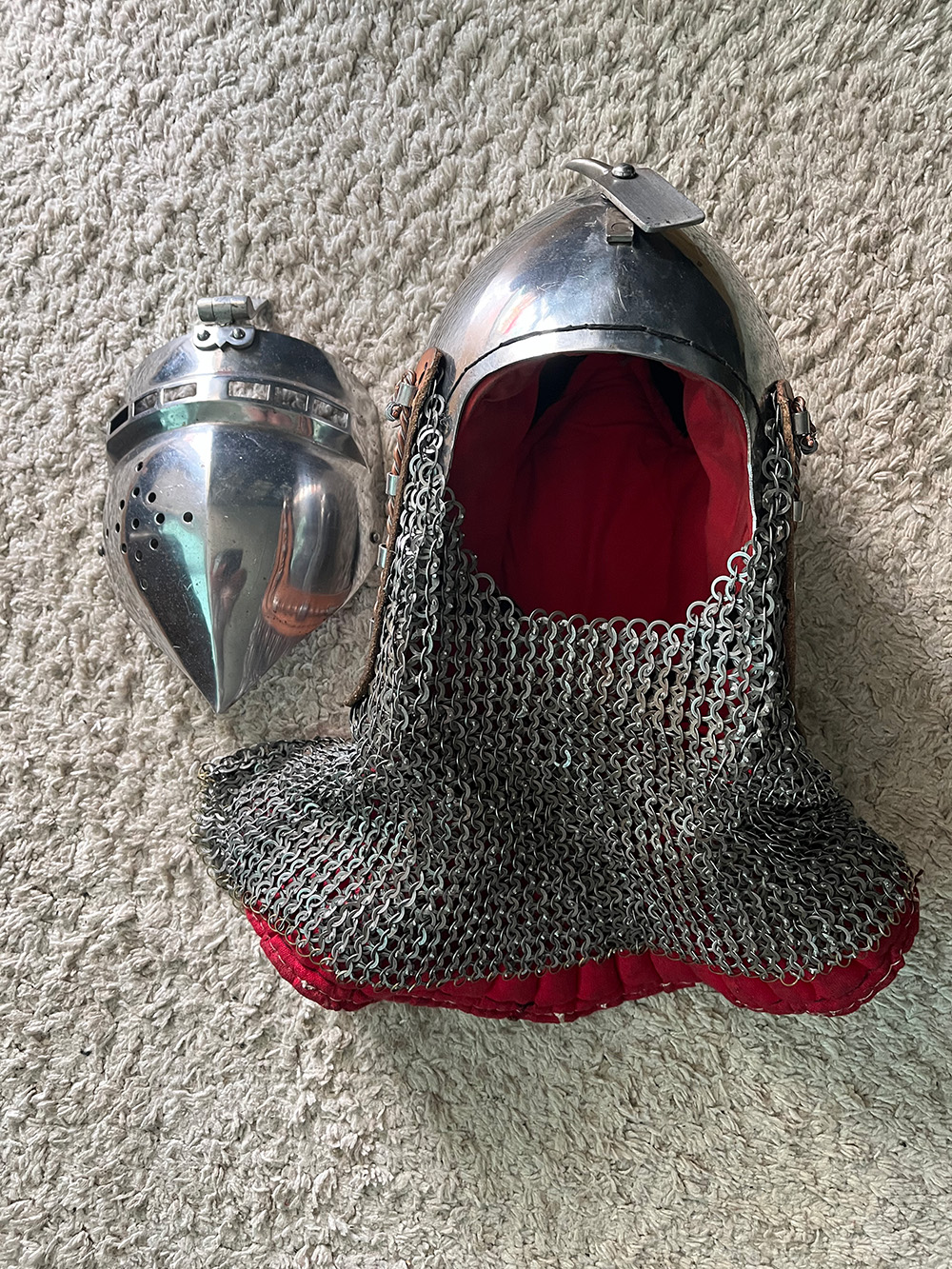 Denna rustning, förutom alla smidda metalldelar, har jag själv gjort. Ringbrynjan består av nästan 30 000 ringar, varav häften är ihopnitade. Kläderna har jag sytt själv efter mönster och med mycket huvudbry. Platan (coat-of-plates) är ihopknåpad efter mönster som bygger på lämningar som hittades i massgraven utanför Visby, från slaget som stod där 1361.