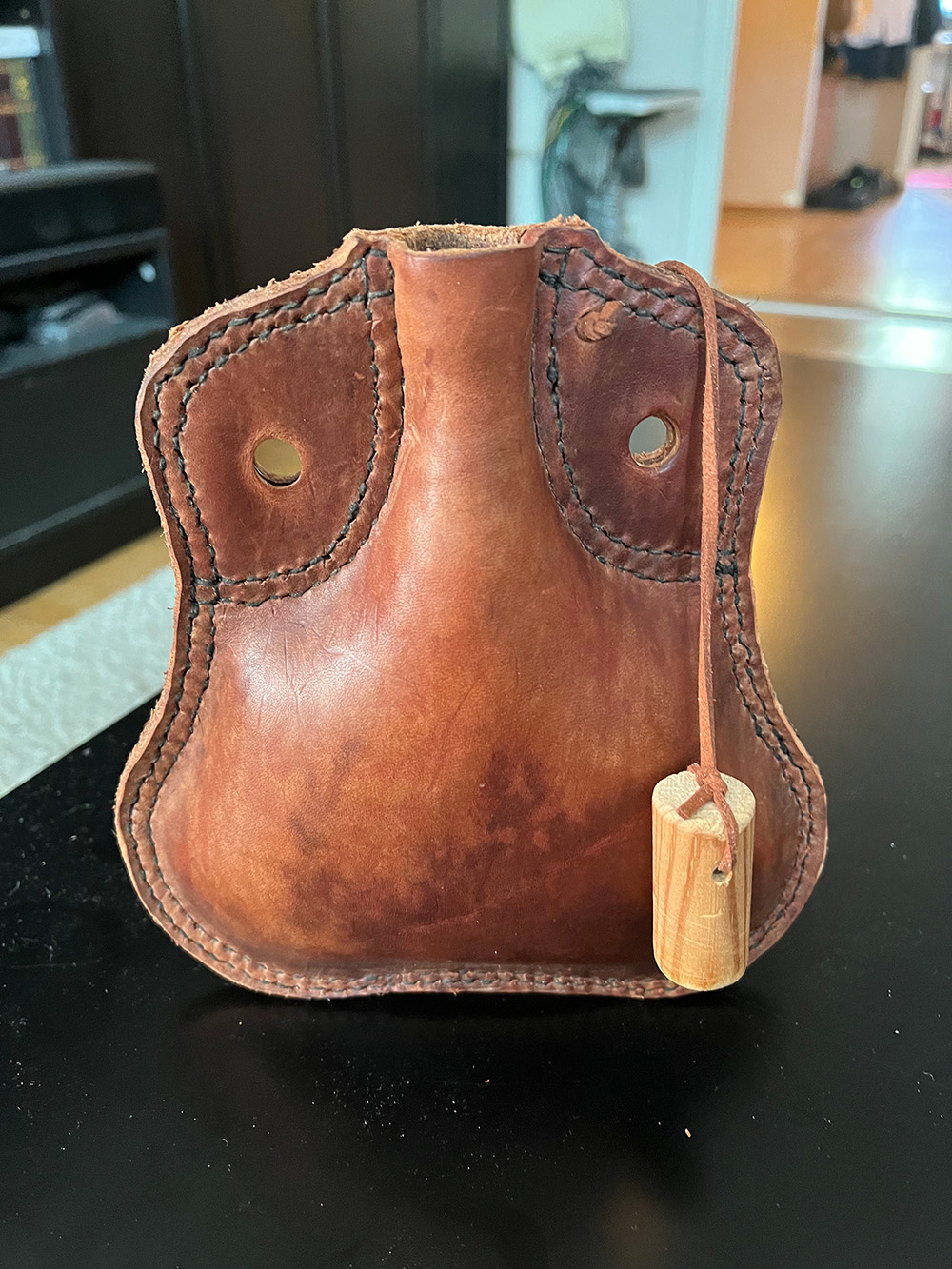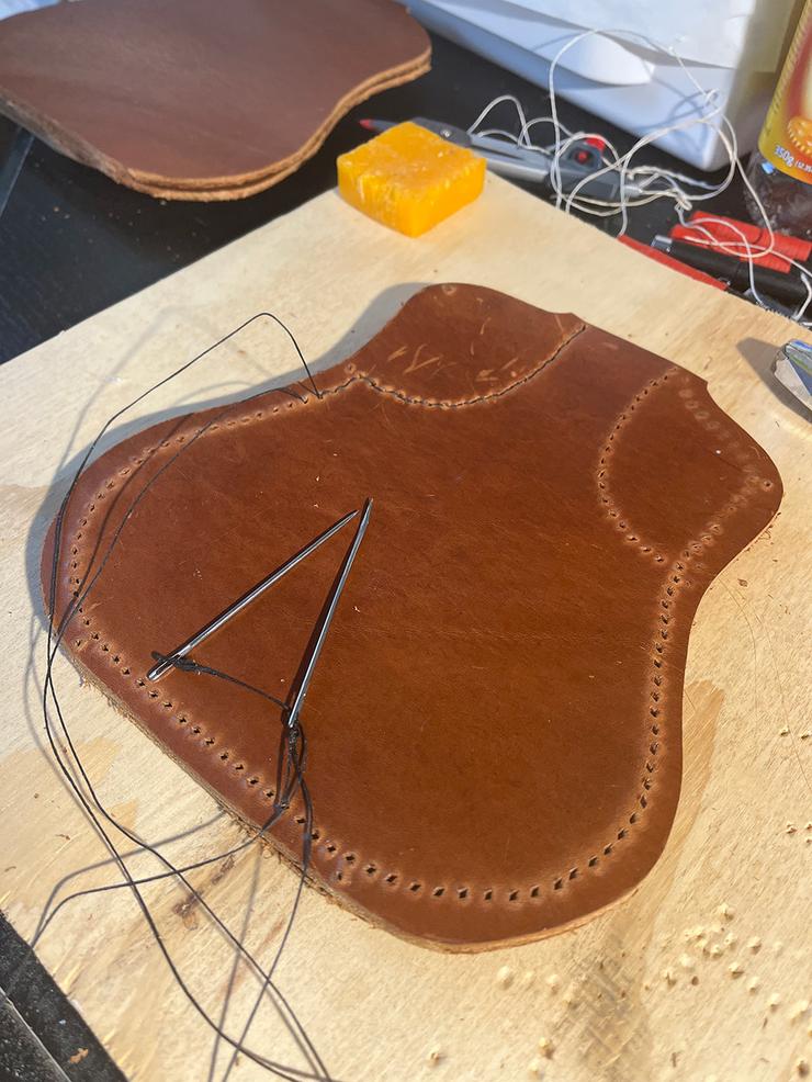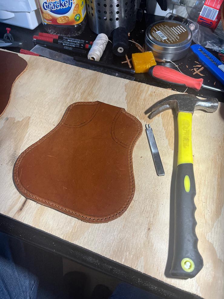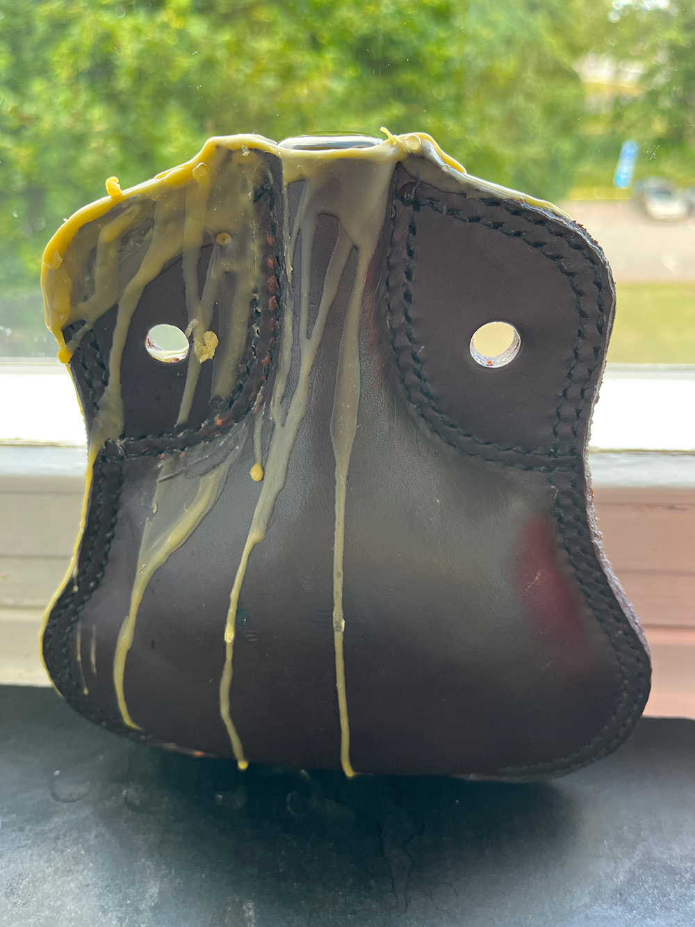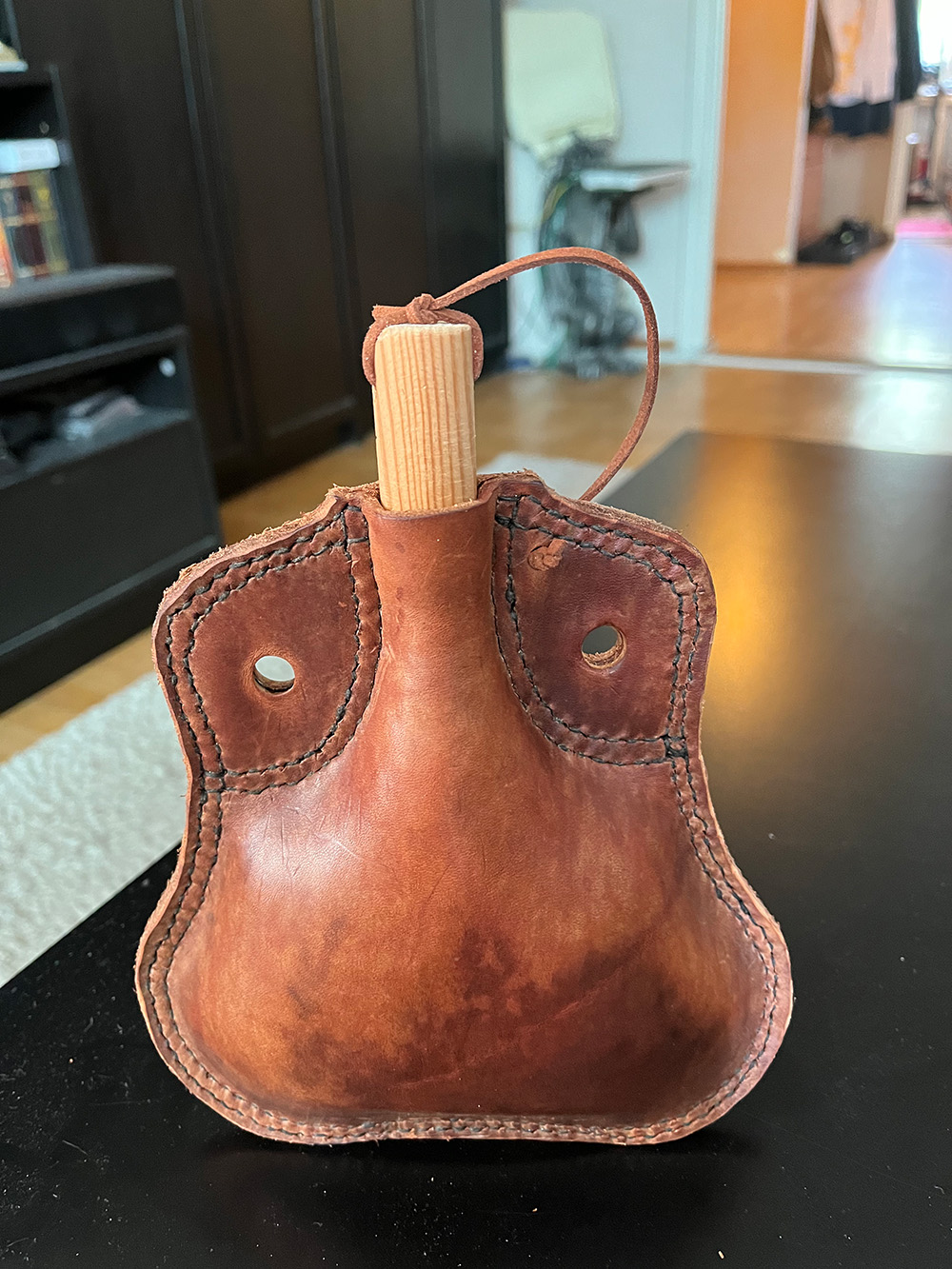 Blderna visar processen i att tillverka en dryckesflaska i läder. Den är sydd med dubbla stygn och inpregnerad/tätad med hjälp av bi-vax.