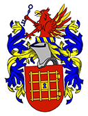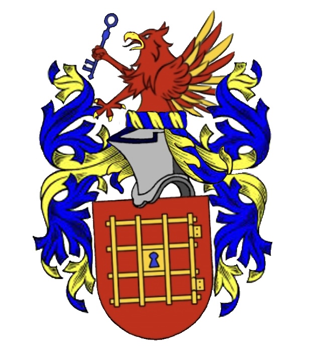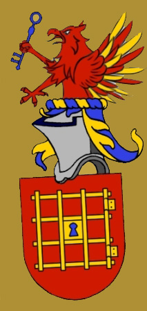 Shield: Gules a lattice door or adorned with a lock-escutcheon or with keyhole azure. Mantling: Azure doubled or. Crest: A demi-griffin gules armed beaked and langued or with flight feathers alternately or and gules, holding with dexter claw a key azure.