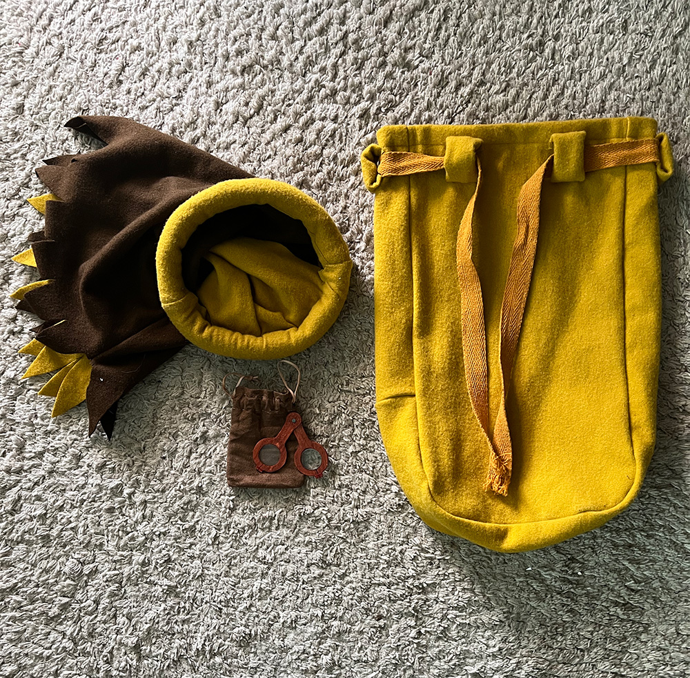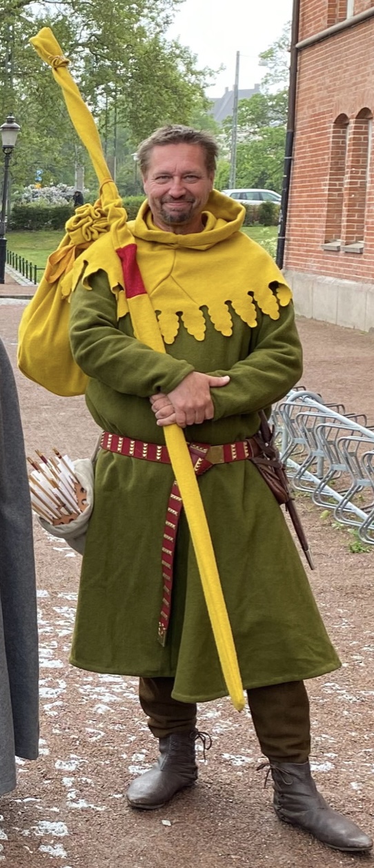 Dessa kläder bygger på de som Bockstensmannen bar. Allt är egenhändigt tillverkat, förutom bågen i fodralet (som jag har över axeln) och bältet m. väska. Men dessa ting ligger på agendan att kanske själv göra en dag. Pilkogret och pilarna är också eget hantverk.