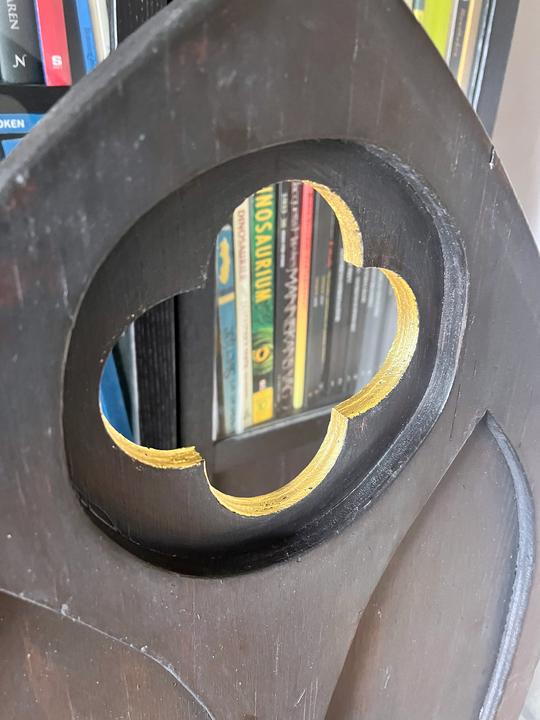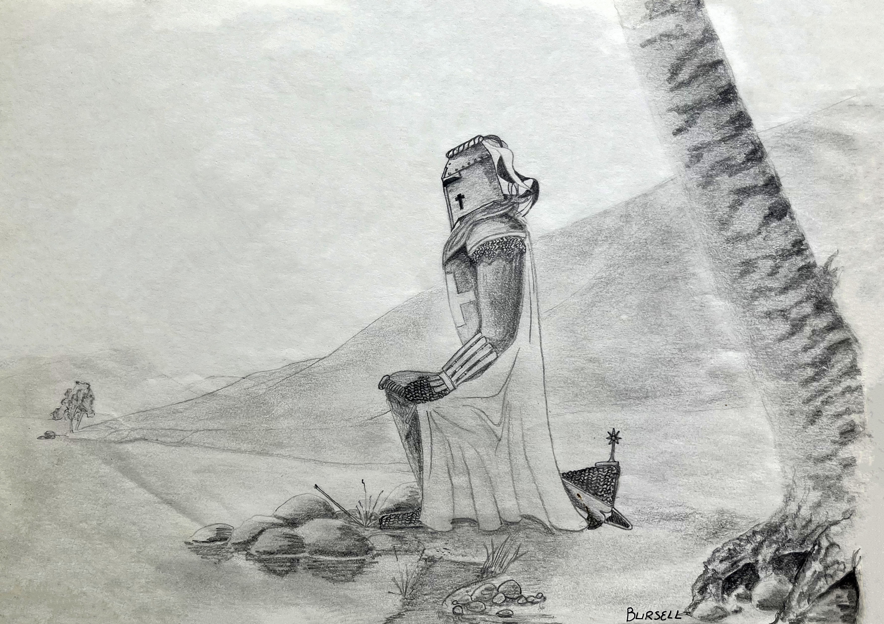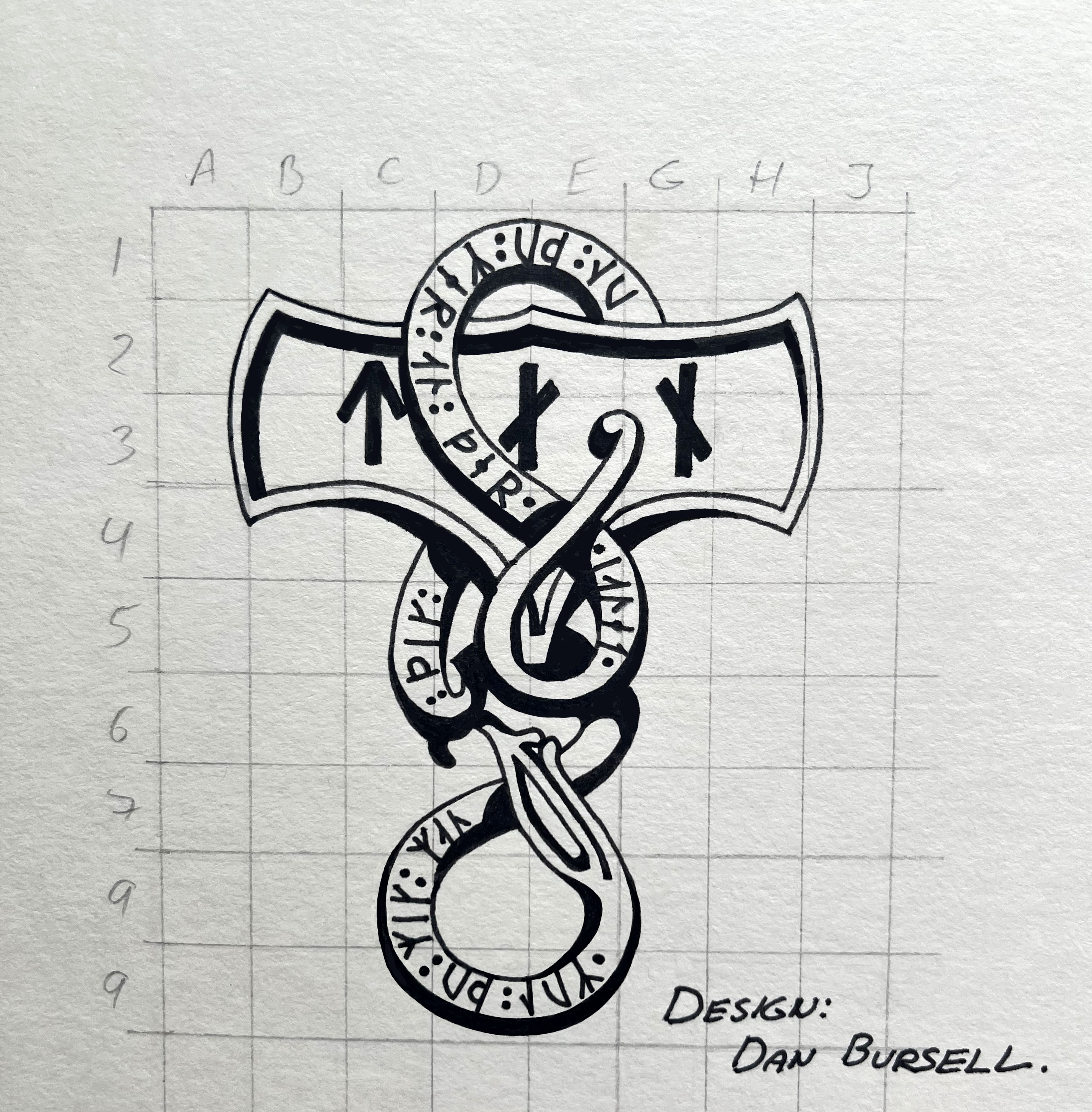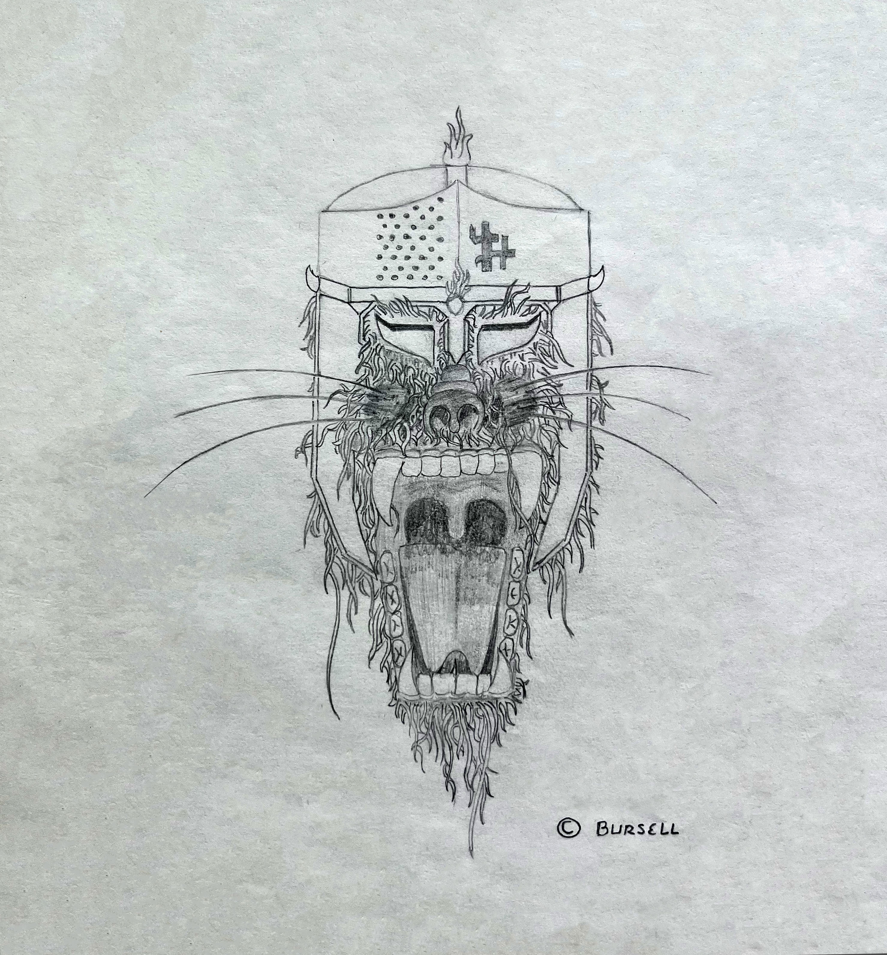 Bilden i mitten, med hjälm och sköld, är mitt personliga vapen. Textcirklarna i ytterkanterna berättar att det är jag som gjort sängen och vilket år den gjordes.
