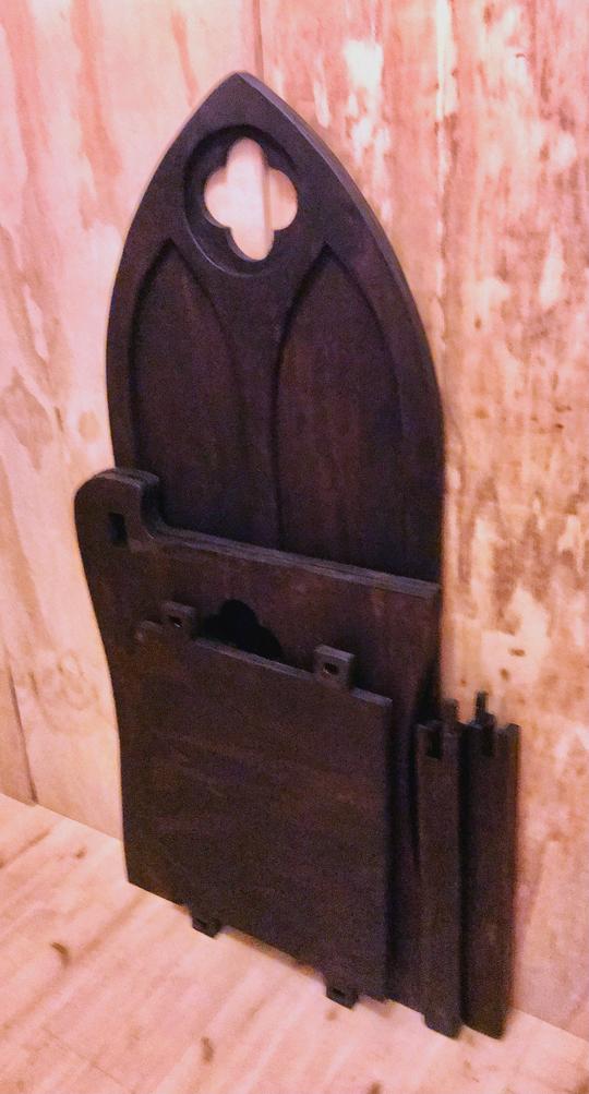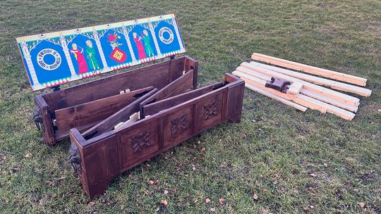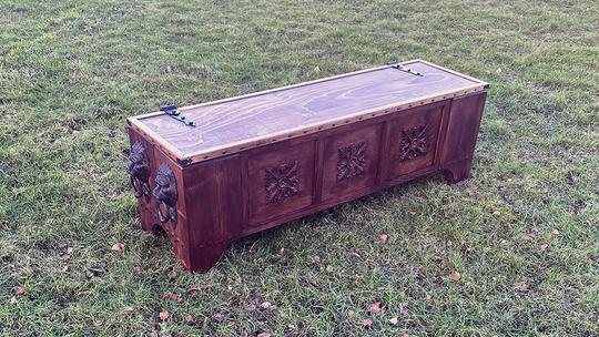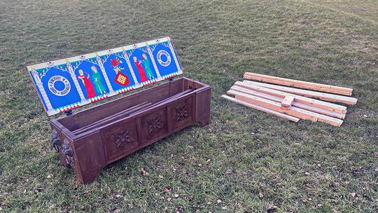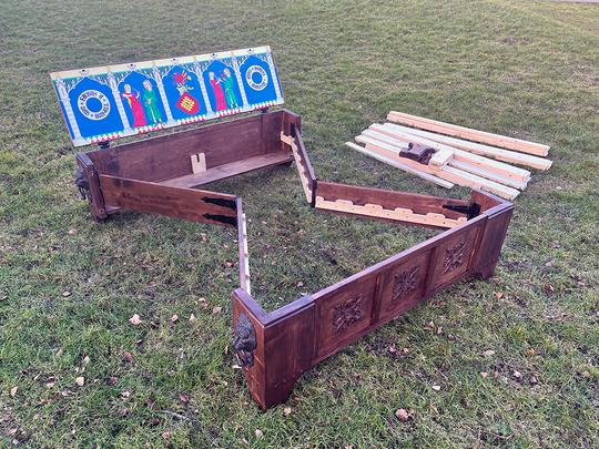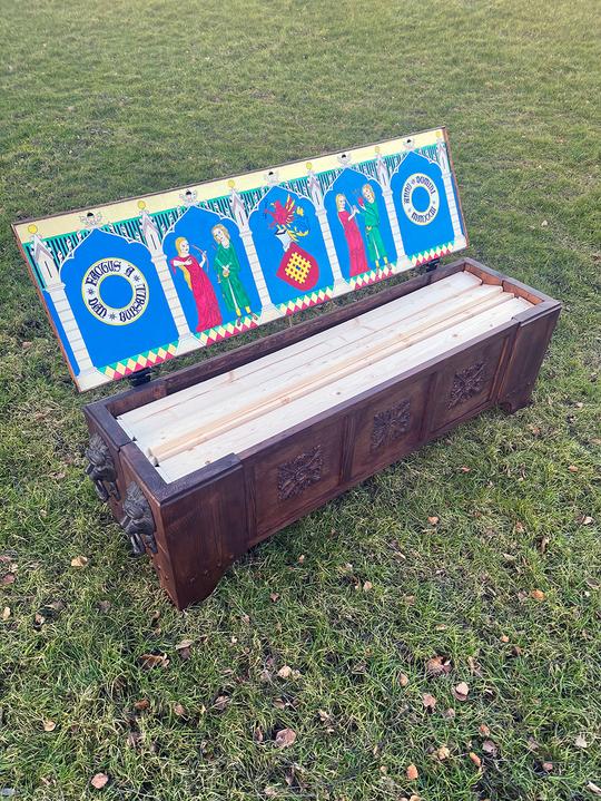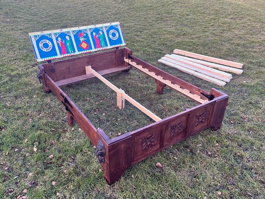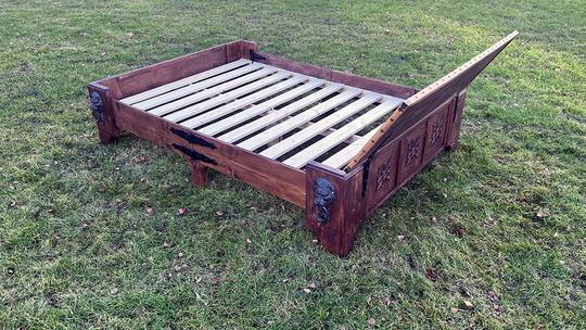 Detta är en säng som jag själv byggt och som det är tänkt att kunna ta med ut när man tältar på medeltidsmarknader och liknande. Orginalidén är inte min men jag har gjort en del förbättringar själv. Orginalmotiven, med de två personerna, finns på en ask från medeltiden.